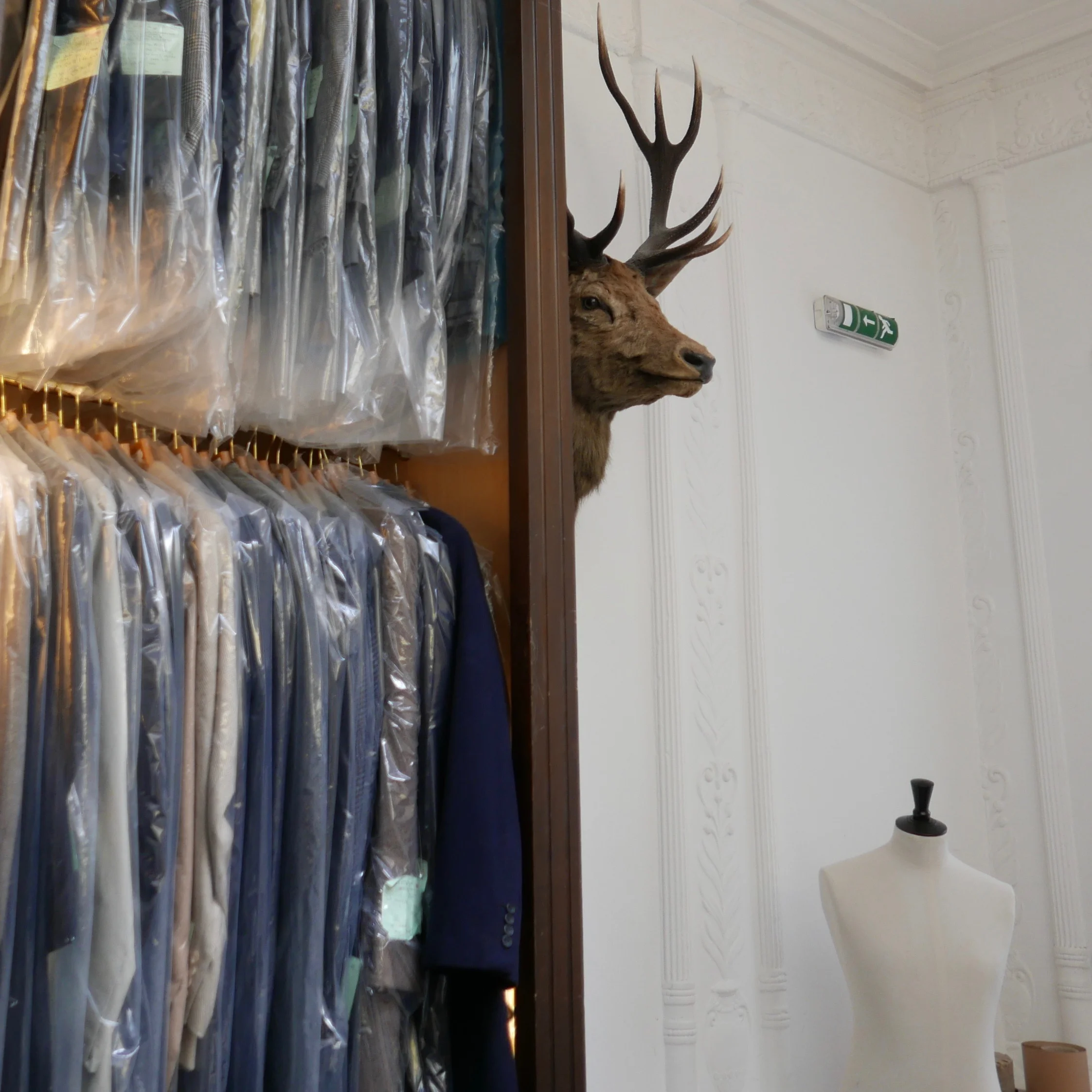The cutting room, well that’s as imagined and more. Hanging patterns surround a stag’s head which gazes around a corner as the large tables cover the lighter, worn, wood floor. There’s that buzz, the electrical charge running throughout the room, shears moving swiftly and smoothly, chalk snaking their path.