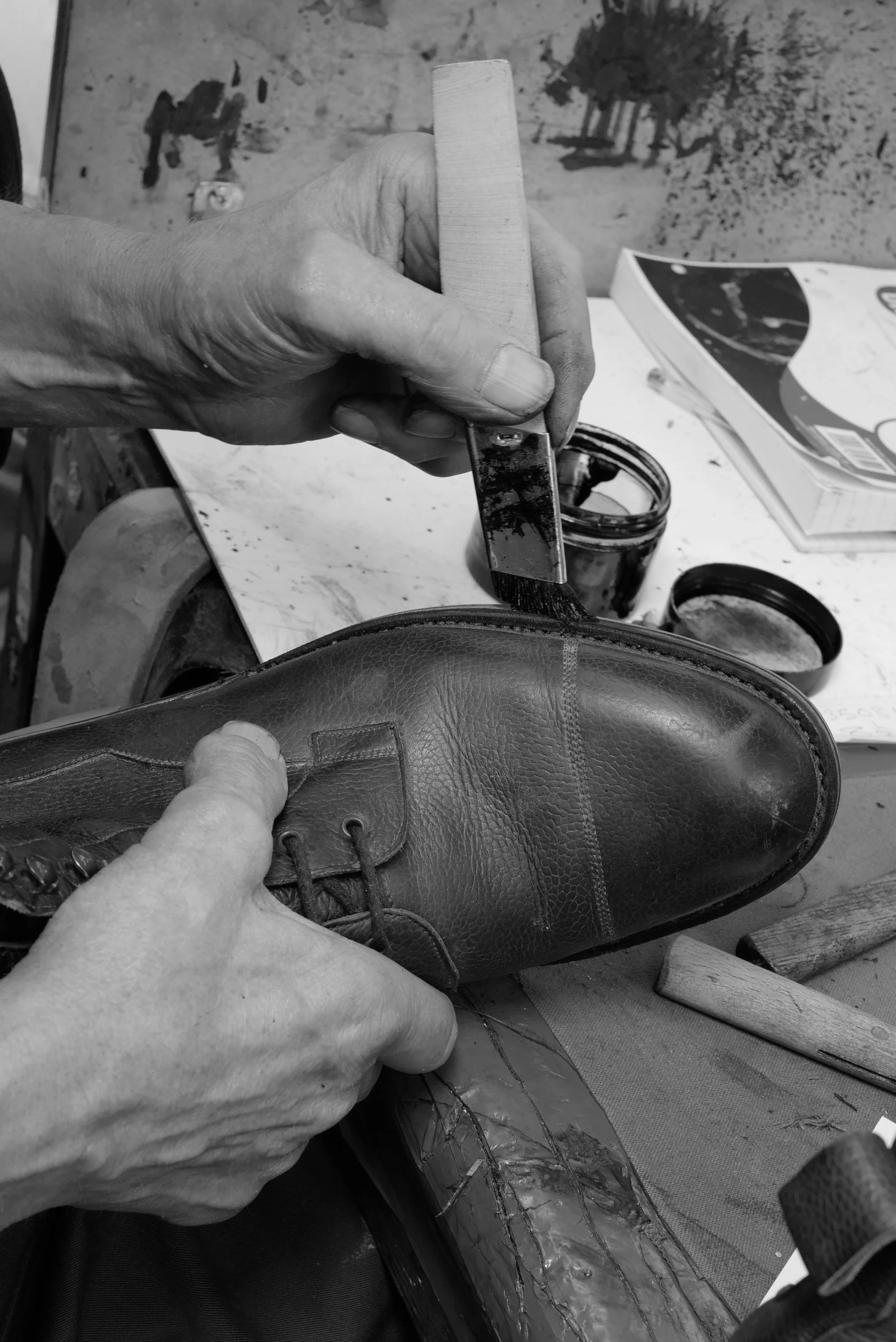 Our sole’s firmly stitched and hammered so now properly stuck are machine sanded, then buffed, sanded some more, buffed and sanded by hand, then each layer is stained precisely by hand using fine angled ‘cutting in’ brushes. How people can draw a poker straight pencil line on a piece of flat paper perplexes me, let alone using a loaded brush stick within fine boundaries further complicated by shape and material. And for it to be done consistently and almost with an artistic shrug? Madness.