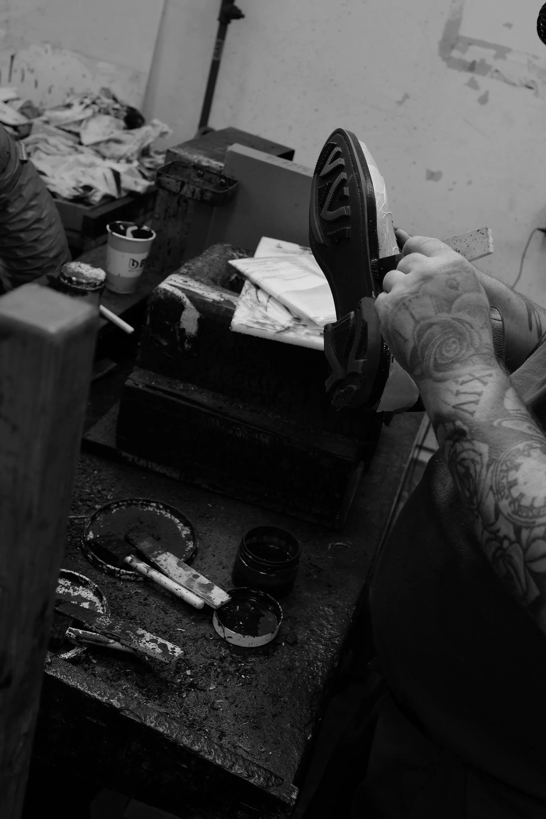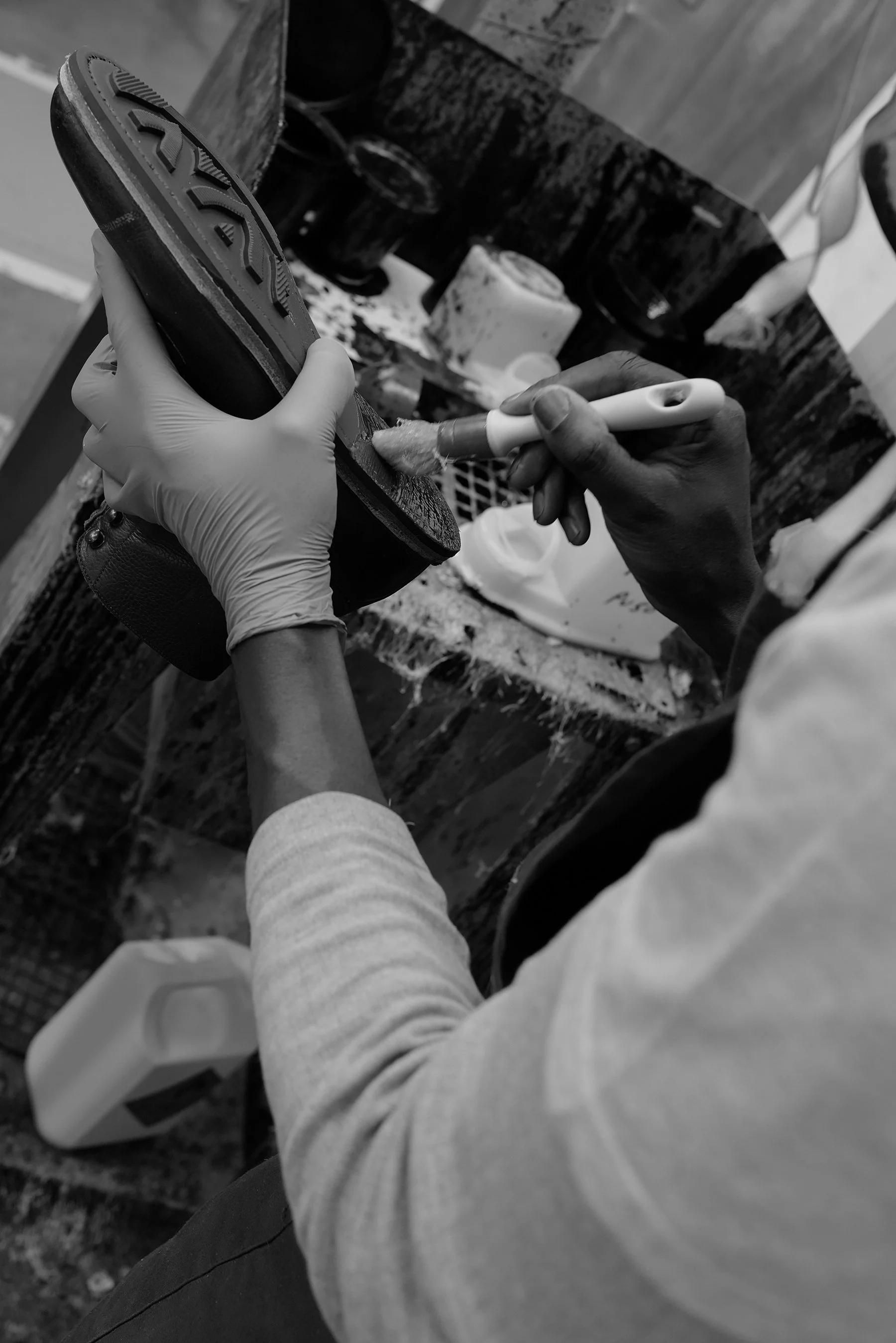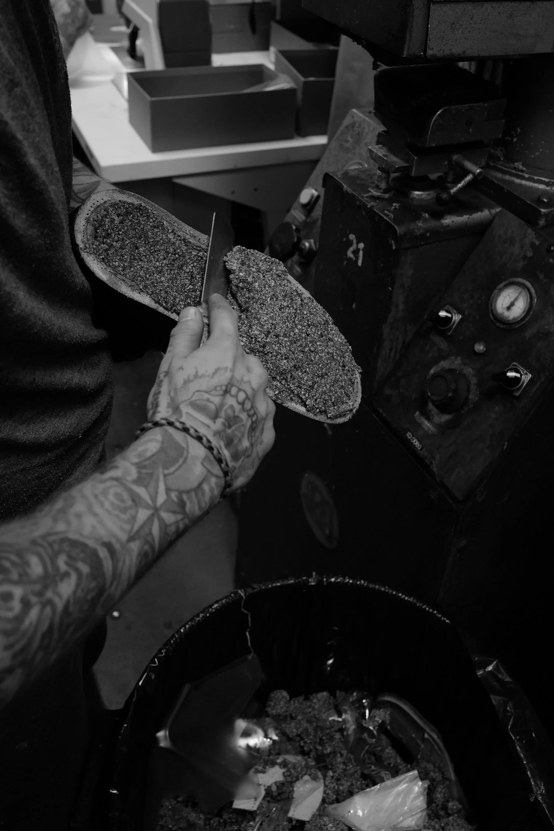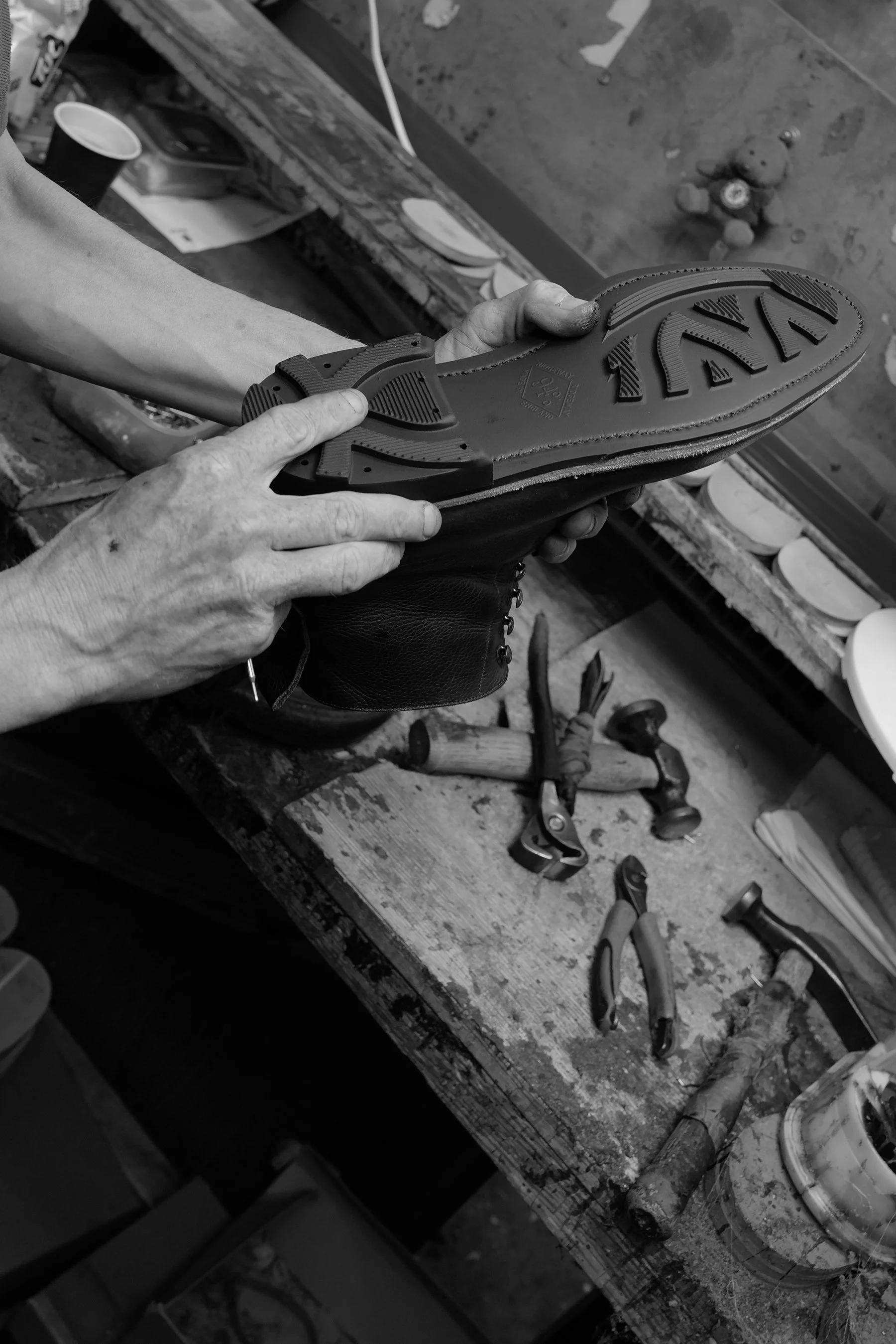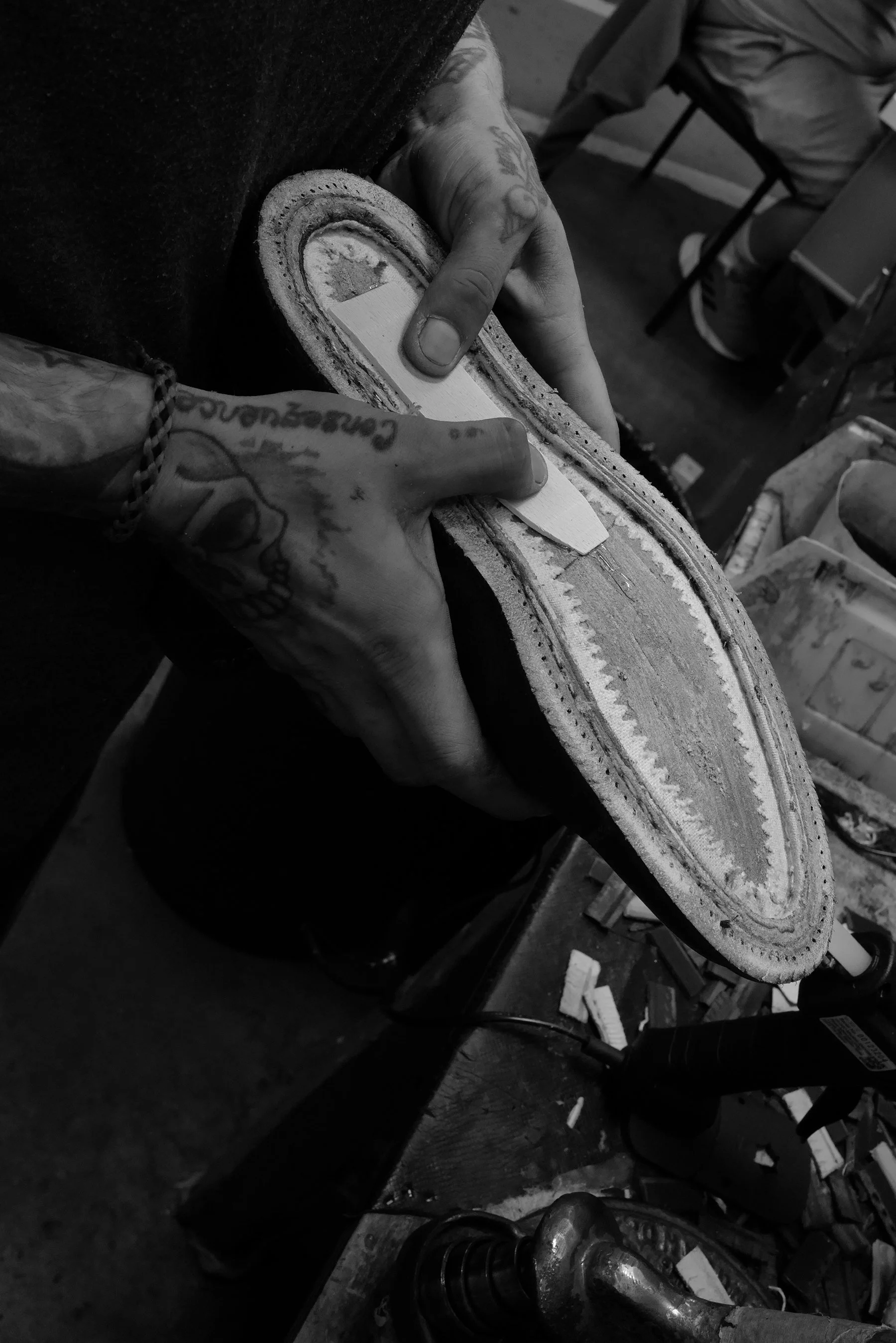Next, a reminder to up my potato peeling skills, as rubber Ridgeway is trimmed smoothly and precisely by hand to match the leather midsole. Once trimmed it is inspected as if a masterpiece undergoing restoration. In my head I thought maybe this was for my benefit with my camera in hand, but later I watched the same thing happen time and again.