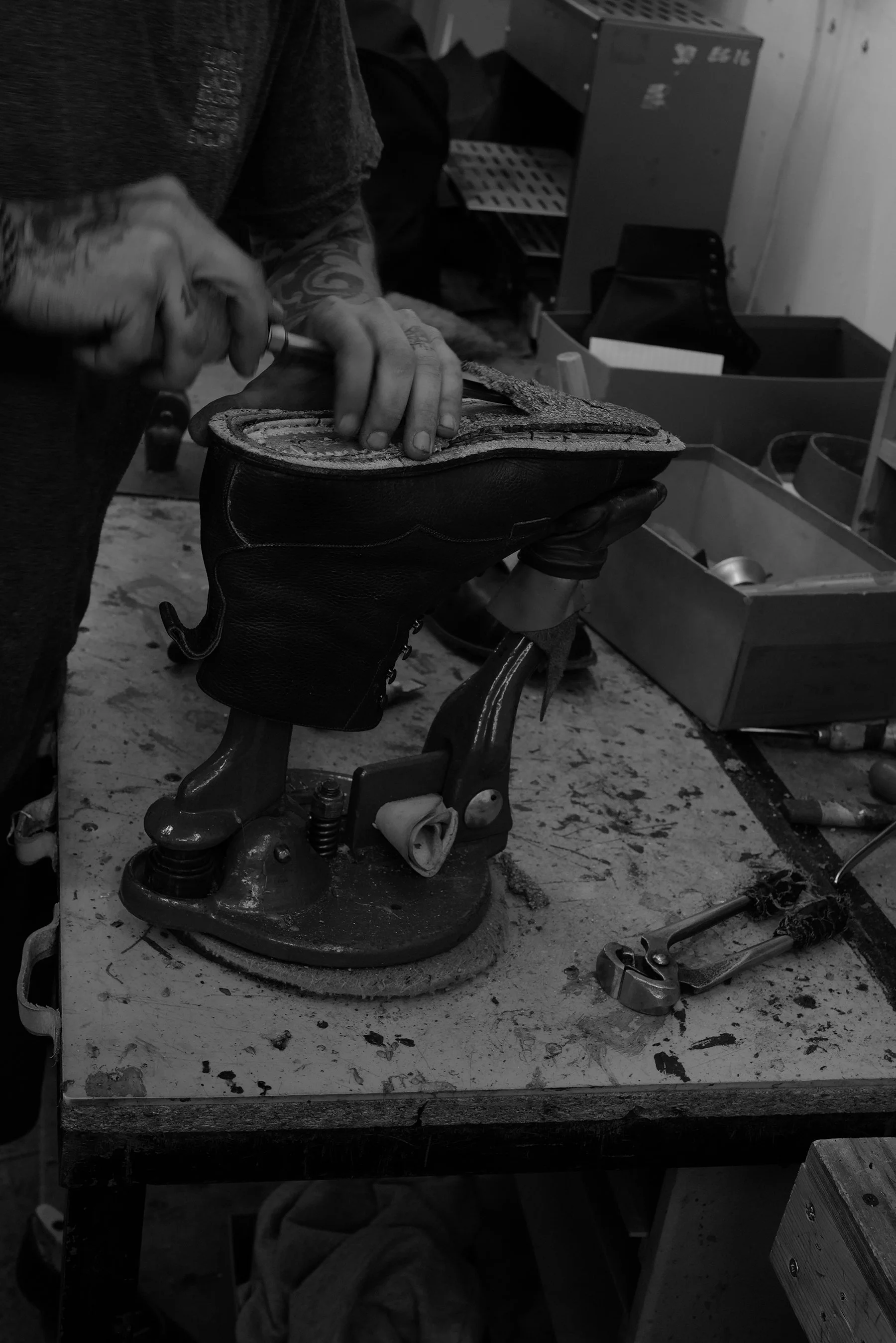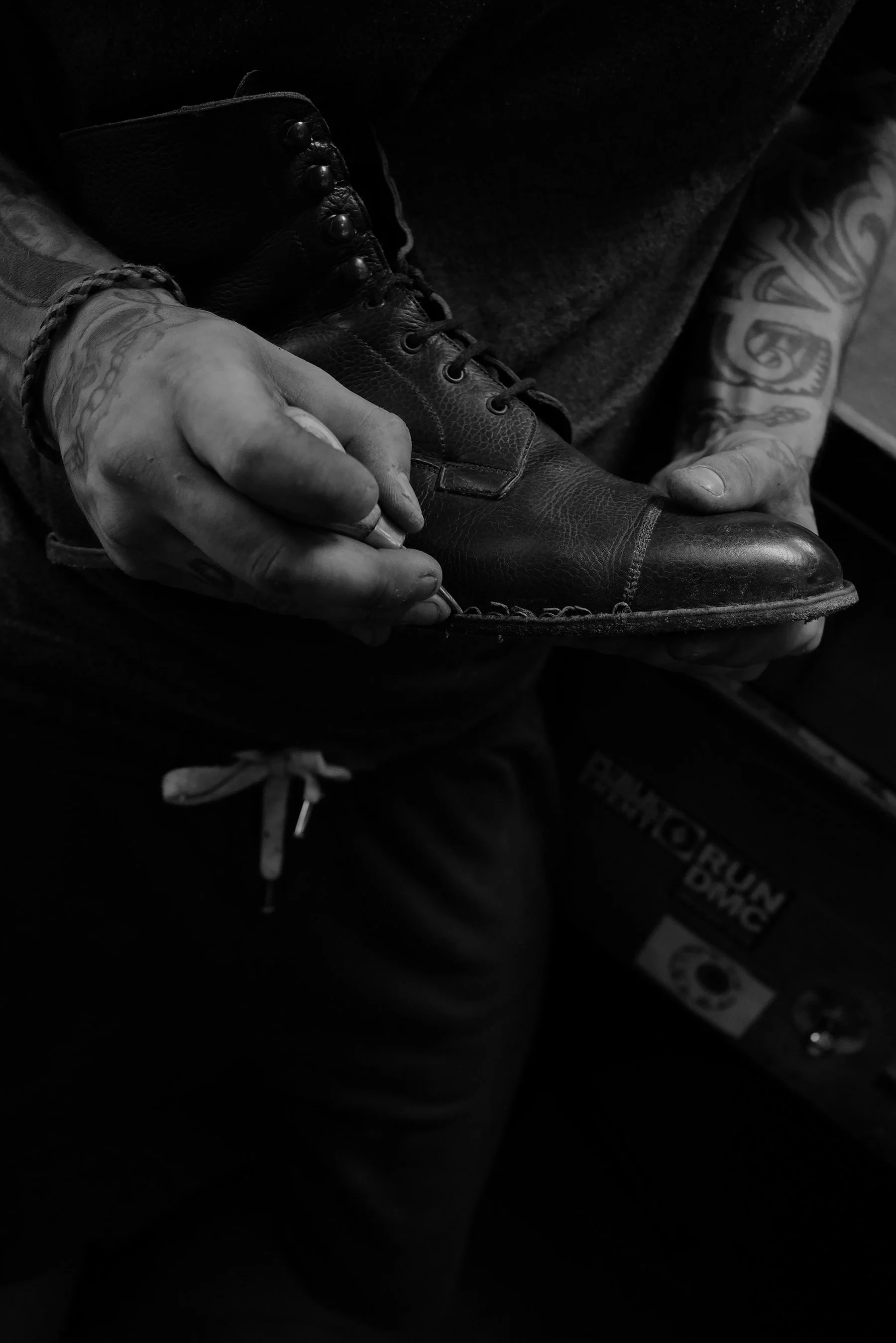 Moment’s later in another room as daylight flooded in, a smile as boots were cradled, by Dan my guide through process, stitches picked and musical preferences discussed.