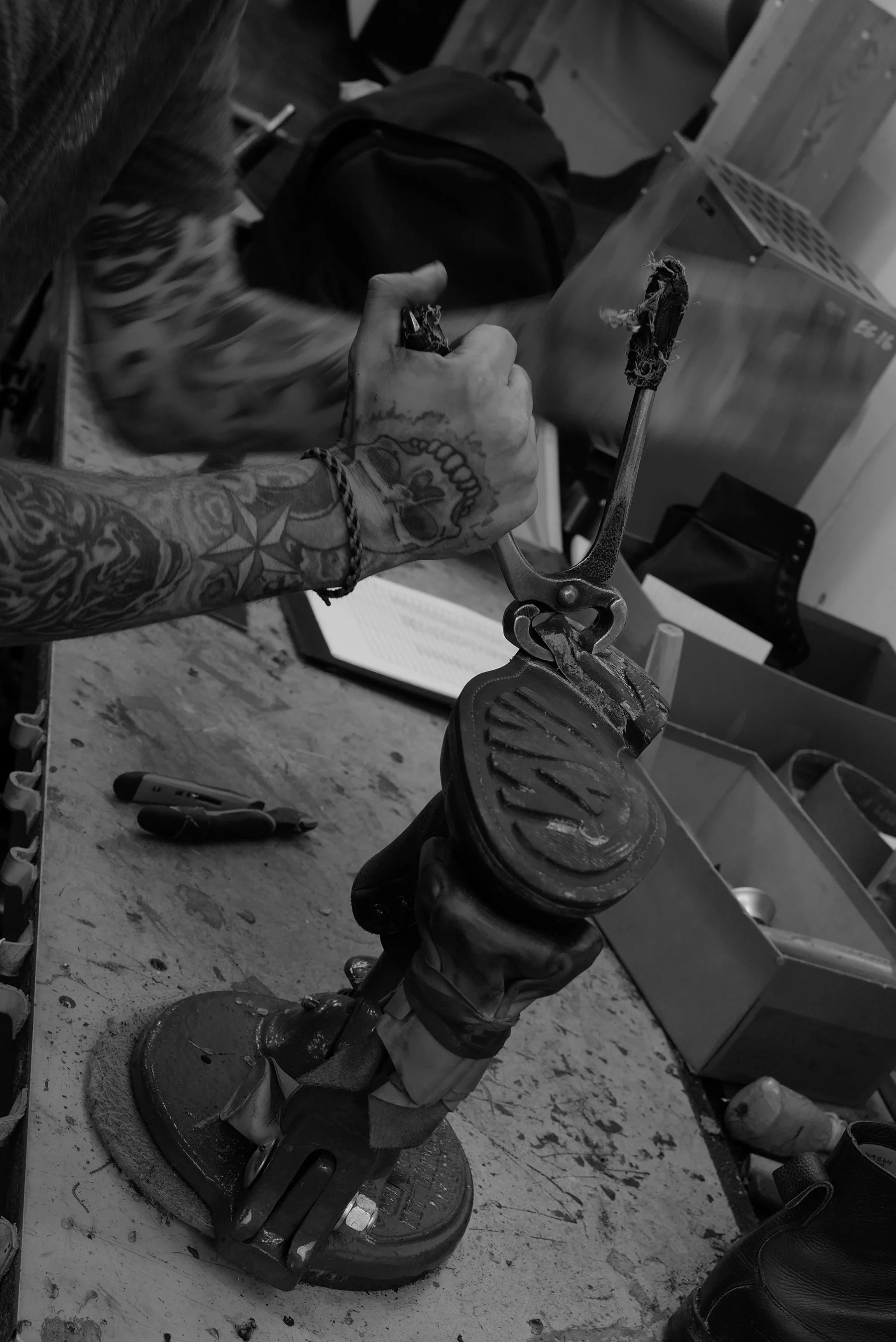 Then popped on the correct resin last, it starts a dance across factory. I spent my time in awe, at the force, the care, the skill and passion, as each well thought out and intentional movement took place and now as I look down at my boot clad feet I can see all of these deft touches.
