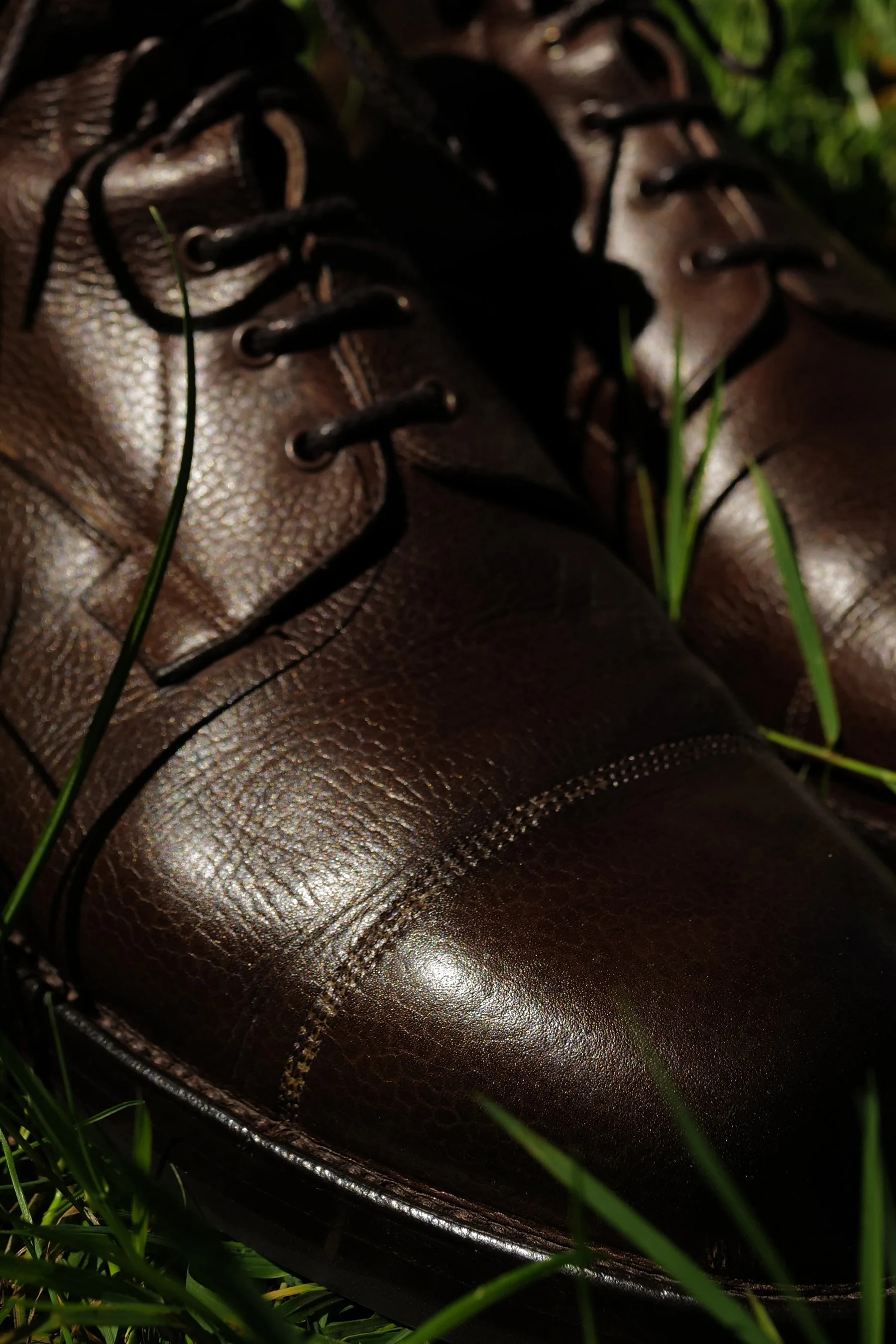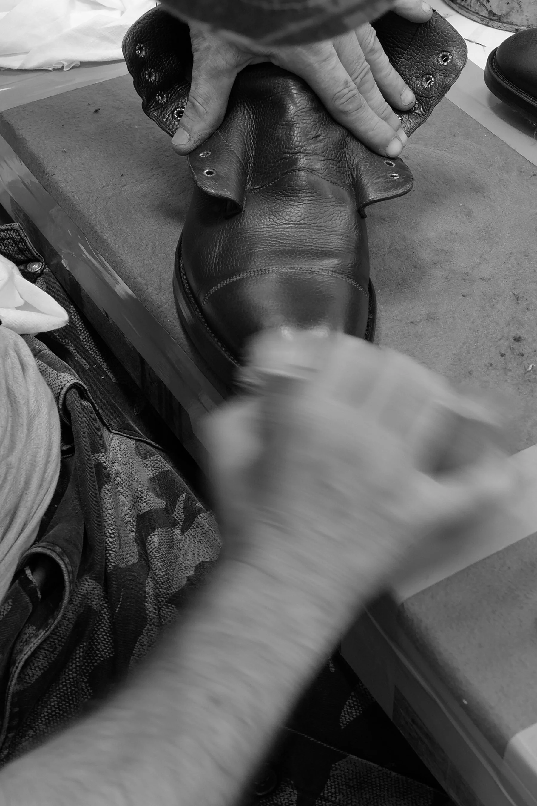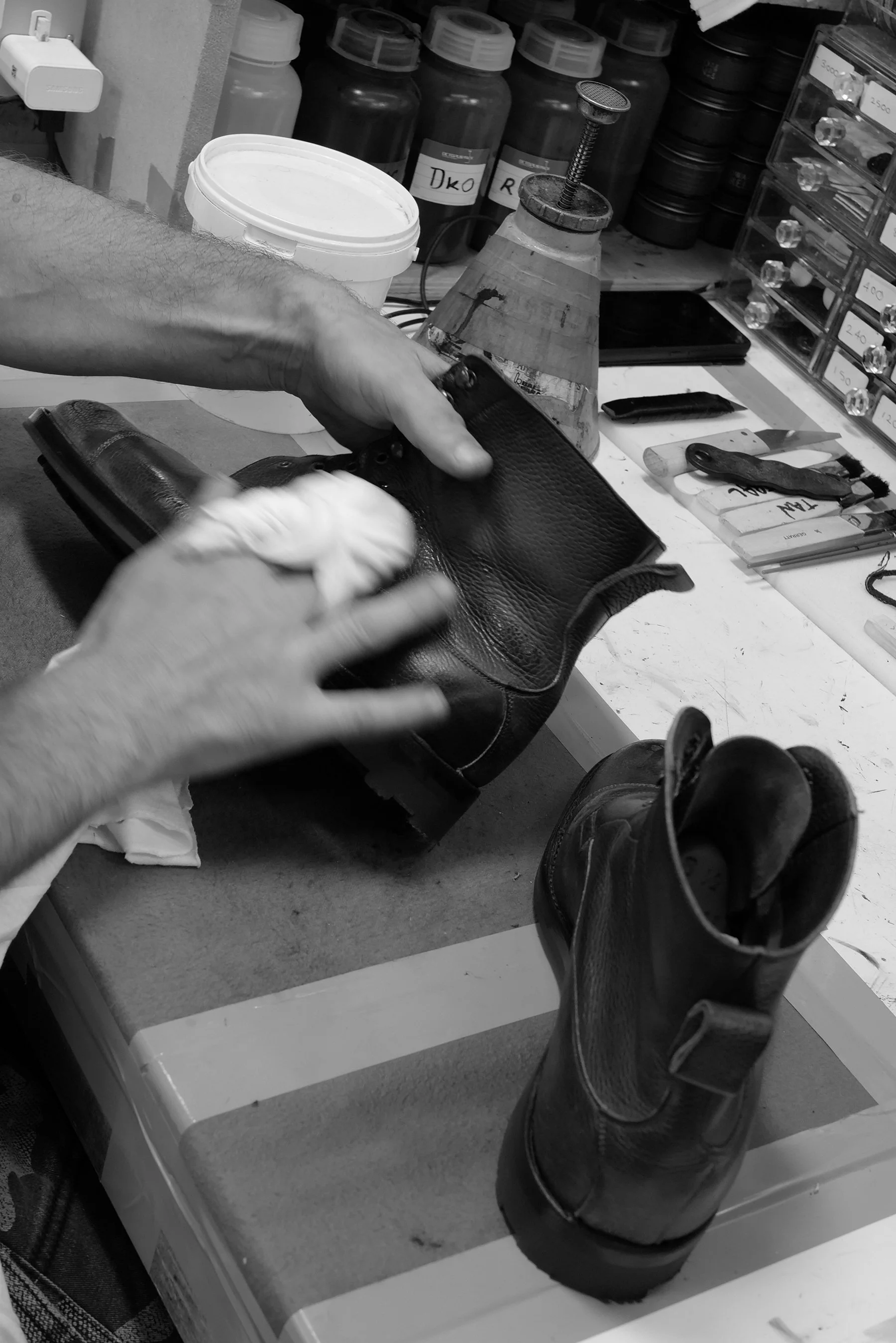 All dry, and edges now buffed and buffed and antique wood cabinet shiny, boots head off for the uppers to be finished, first polishing by hand, sponges, creams, waxes, fingers and cloth all in play, building up layers, before a brush in hand runs forward and back, faster and faster until reaches what I might - if was ever able to replicate - call perfection and finished, but is just another step and followed by a couple of trips with alternating brushes on the polishing machine.