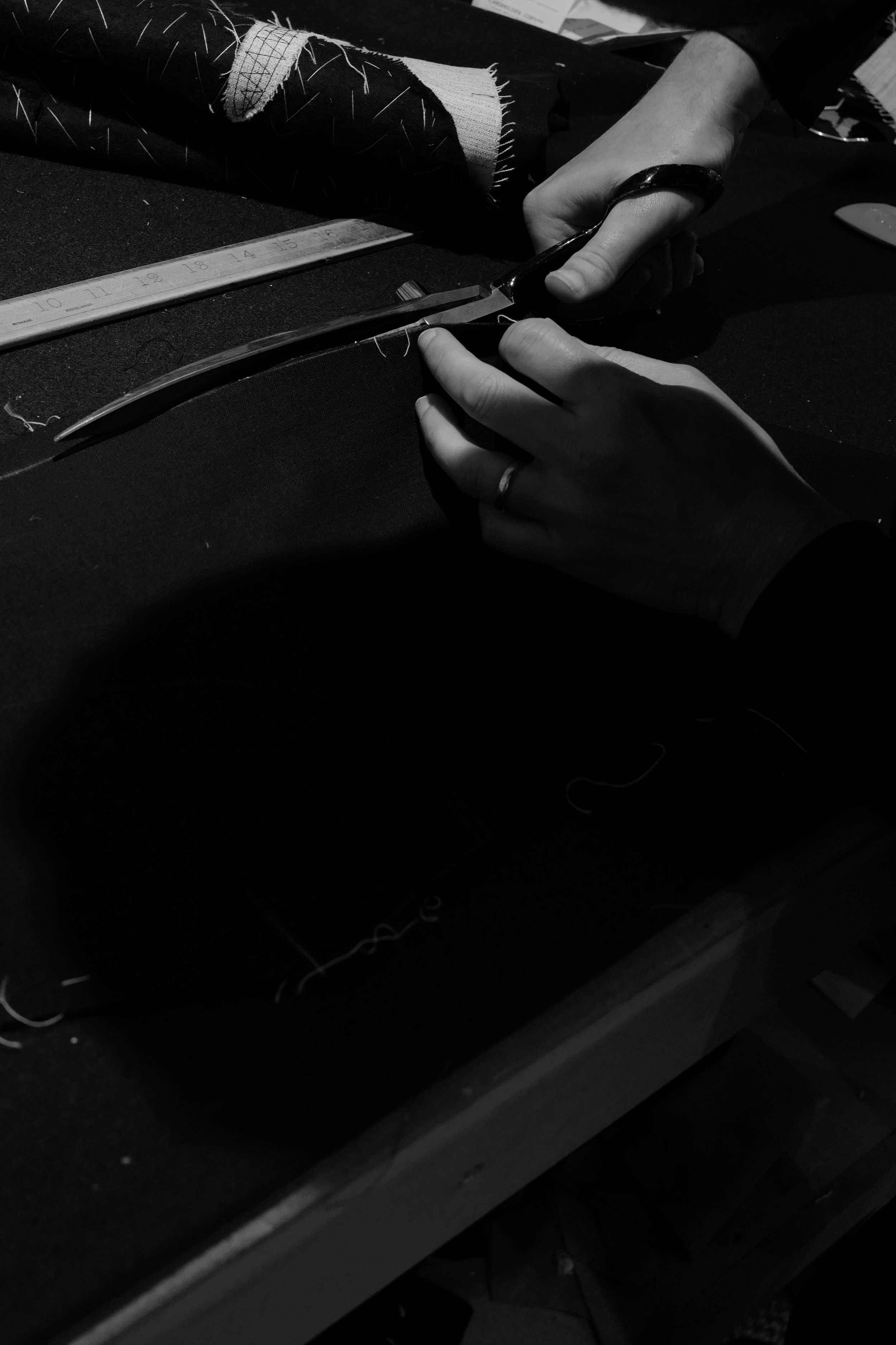 Tom cuts a tailored and structured coat, it’s all about long clean lines, long clean lines and long clean lines. House style is one button – a wink to his start at Huntsman - with a 4 inch notch lapel, straight jetted pocket, high arm, little shoulder rope, two vents, trousers with an 11 inch rise, straight, sometimes a little kick from the knee, mostly sober English cloth, some Italian, some French, bit of Lora Piana and Dormeuil and occasionally something a little different; cloth found in under the radar haberdasheries.
